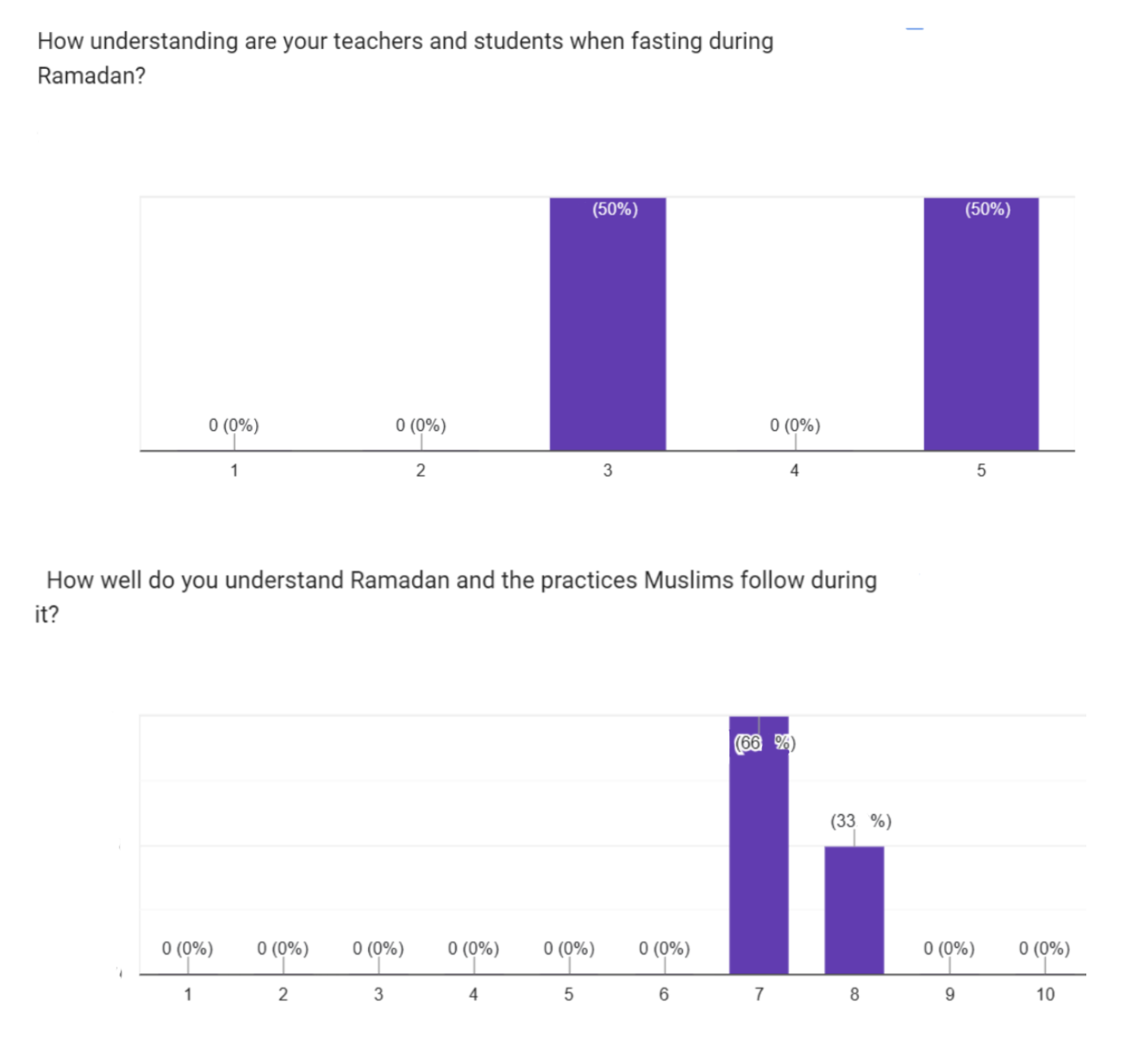 The following are the results of anonymous surveys for students who observe Ramadan followed by those who do not: